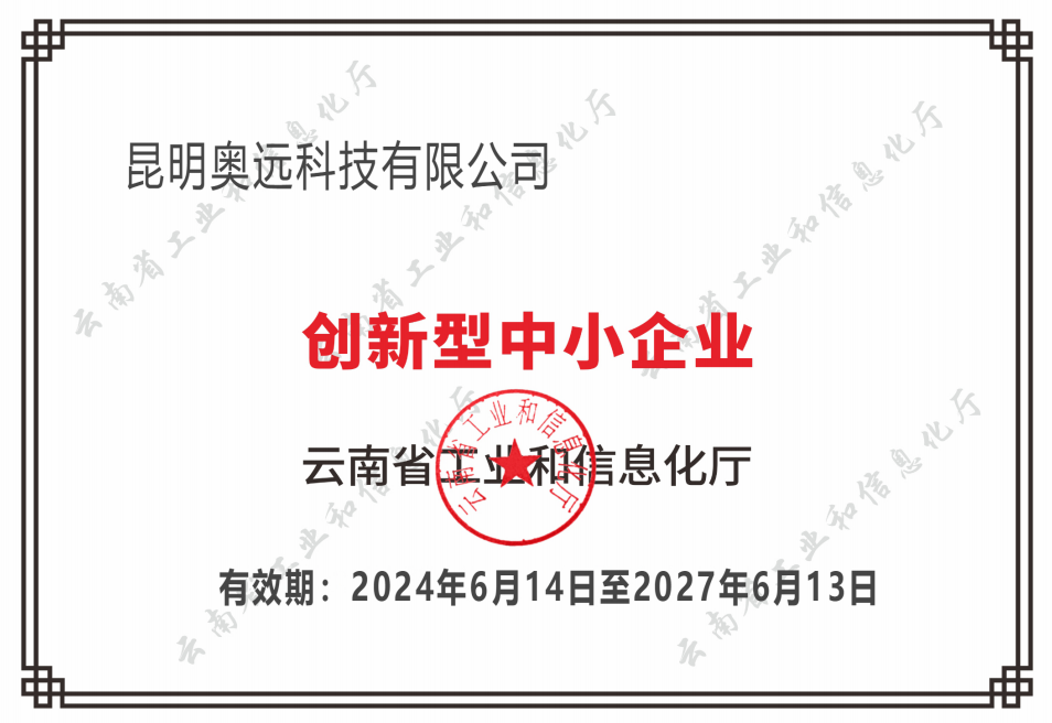 近日,昆明奧遠(yuǎn)科技有限公司被云南省工業(yè)和信息化廳授予“創(chuàng)新型中小企業(yè)”稱號,這一榮譽(yù)不僅是對公司在創(chuàng)新領(lǐng)域所取得成績的高度認(rèn)可,更是對其未來發(fā)展的極大鼓勵。